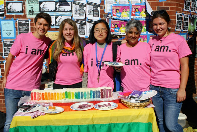 Пятеро людей одеты в одинаковые розовые футболки, спереди которых написано «I am». Джеймс — светлокожий парень с короткими темно-русыми волосами. Джулия — светлокожая и светловолосая женщина в радужном шарфе. Лидия (я) — девушка азиатской внешности с черными волосами и с синим шнурком на шее. Шива — женщина североафриканской внешности с коротко подстриженными седыми волосами. Меган — белая женщина с темно-коричневыми волосами, забранными в хвост, и на голове у нее подняты солнцезащитные очки. Перед этими пятью людьми стоит стол, покрытый радужным флагом, на котором лежит двадцати-восьмислойный длинный радужный торт с глазурью. За ними находиться кирпичная стена, на которой висят всевозможные колледжевские флаеры)