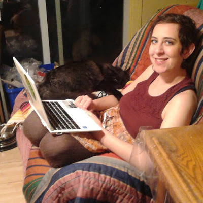 (Автор сидит с ноутбуком на коленях. Рядом с ней лежит черный кот)