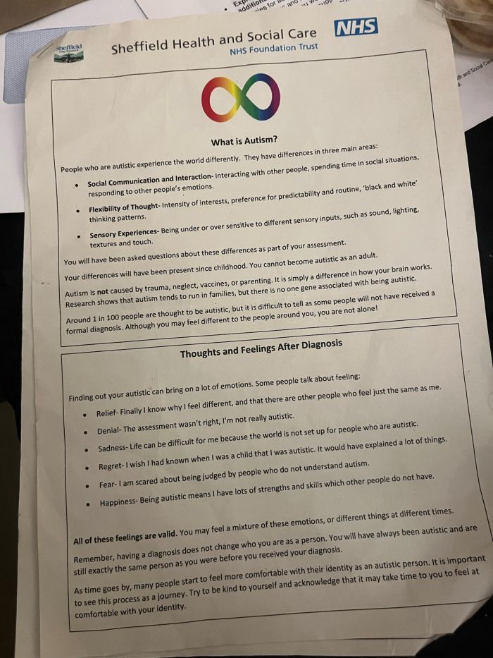 В конце Доктор Кларк сказала мне, что я очевидно аутична, что она рада, что ей не пришлось опровергать мой диагноз. Она дала мне общие бумаги, которые дают всем в клинике, — «что такое аутизм?» и вторую, с информацией другого типа (например, в ней были советы носить наушники и использовать специальные игрушки для стимминга, если это нужно). Я не помню, куда положила эту бумагу, возможно, расскажу подробнее, если найду. Также доктор посоветовала мне две шеффилдские организации для аутистов, объяснила, что мои документы с диагнозом придут мне по почте в ближайшие дни и сказала, что после получения бумаг я смогу записаться на бесплатную консультацию.